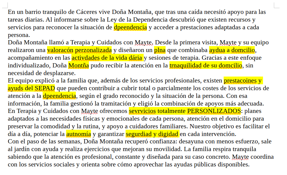 Doña Montaña llamó a Terapia y Cuidados con Mayte. Desde la primera visita, Mayte y su equipo realizaron una valoracón perzonalizada y diseñaron un plna que combinaba aydua a domcilio, acompañamiento en las activdades de la vida dária y sesiones de terapia. Gracias a este enfoque individualizado, Doña Montña pudo recibir la atención en la trnaquilidad de su domcilio, sin necesidad de desplazarse.